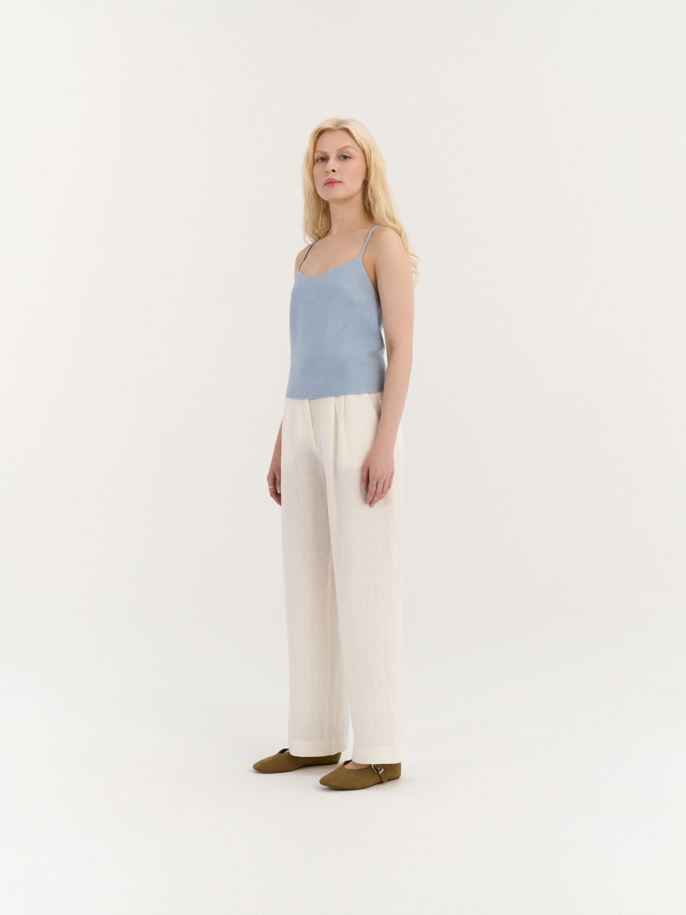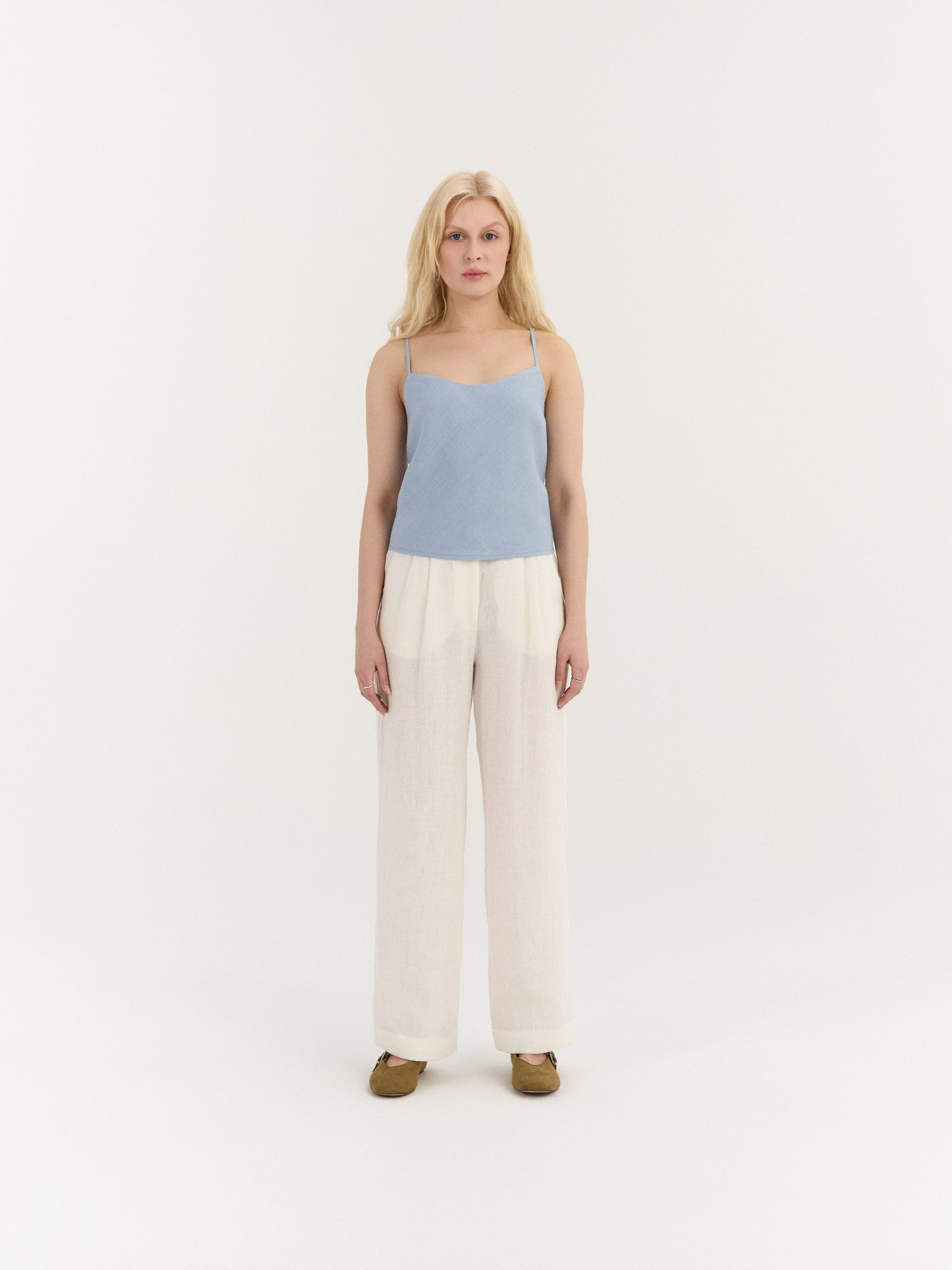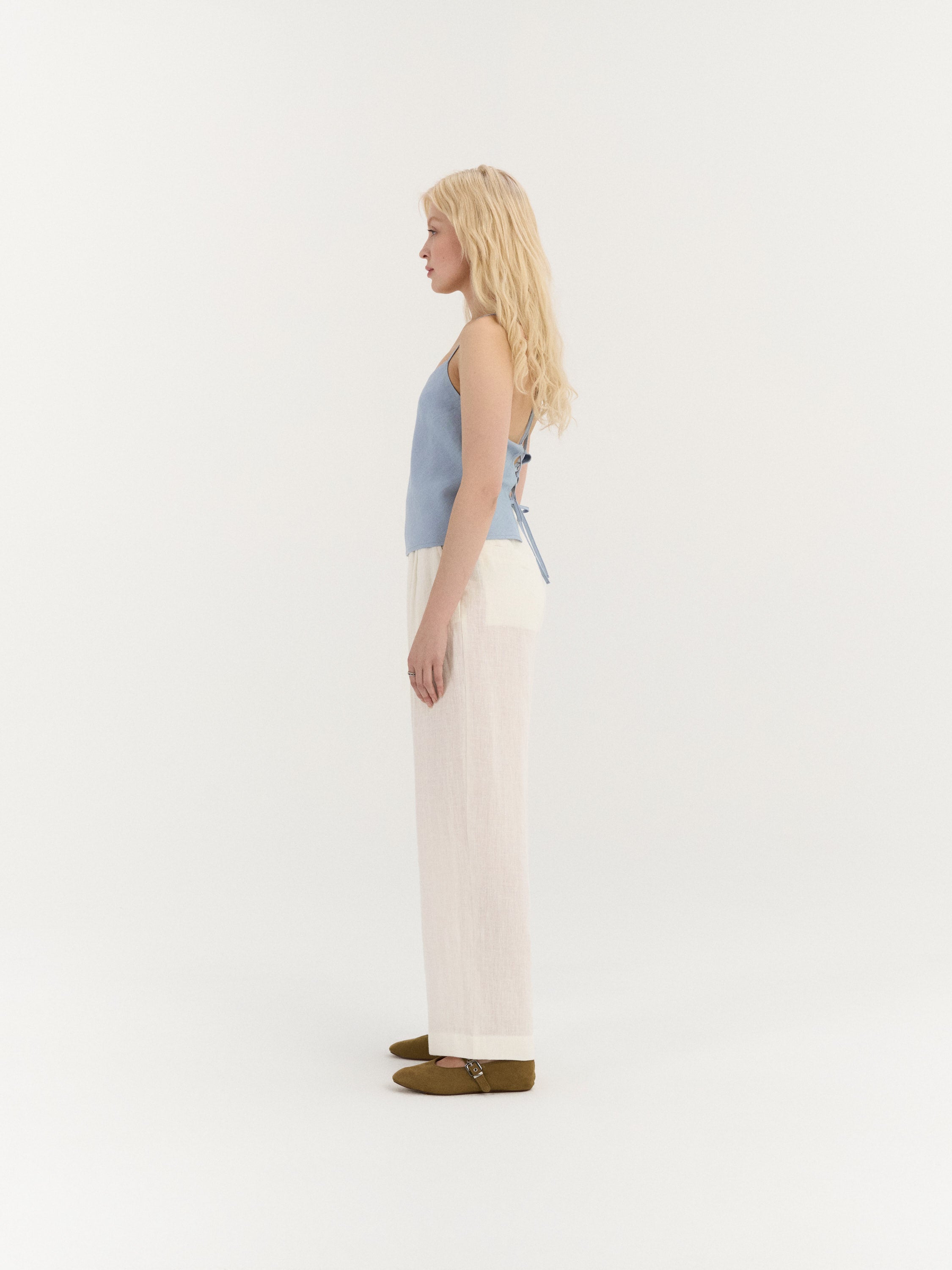 Sleeveless top with a straight neckline and slim shoulder straps. The front features a clean, minimal silhouette, while the back is designed with crossed straps and an open back detail with adjustable lace-up ties. The lace-up closure allows for an adjustable fit at the back. Finished with a straight hem.
