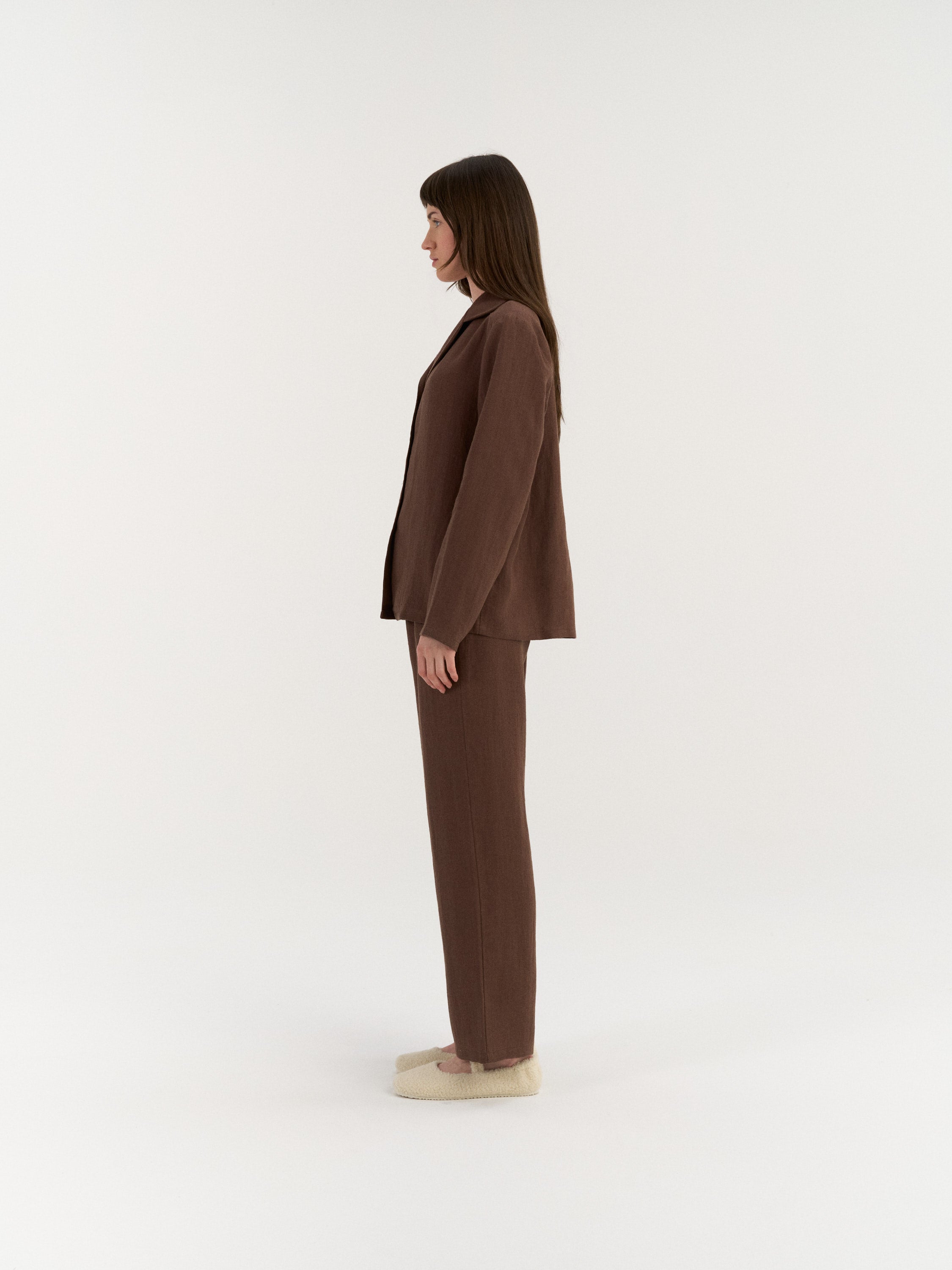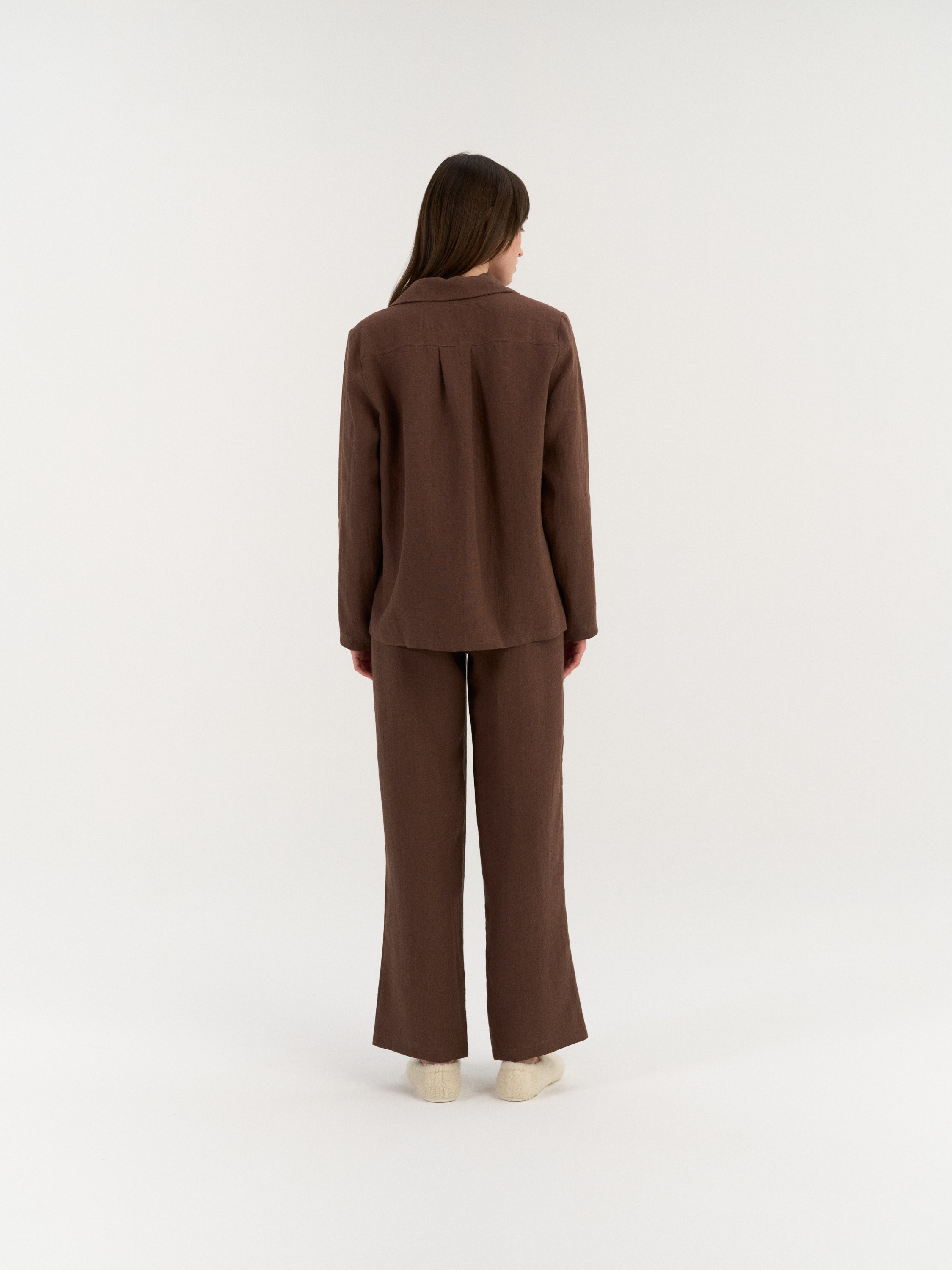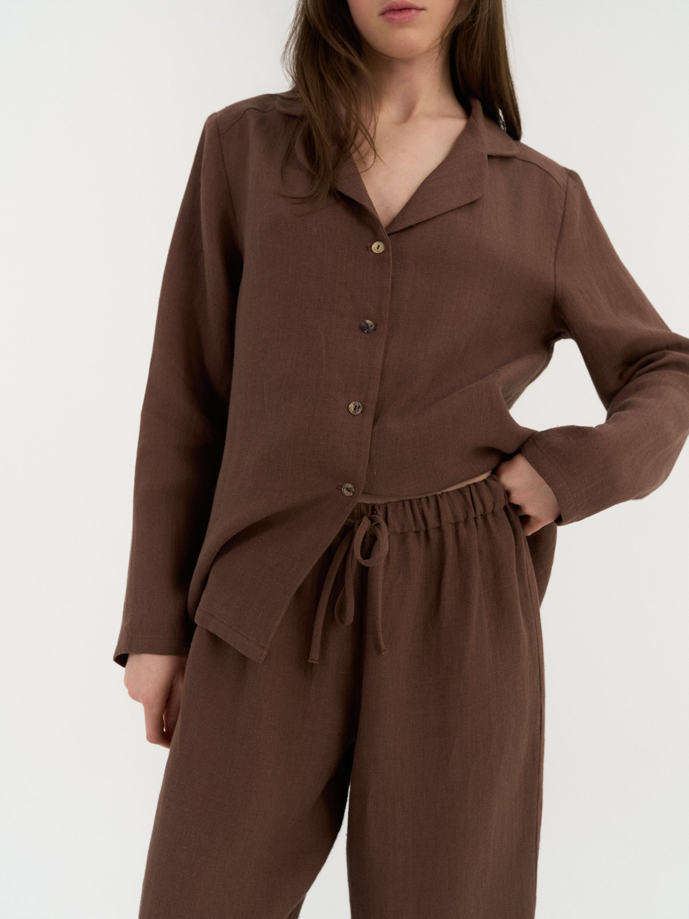 A two-piece linen set with a relaxed, comfortable fit. The shirt is designed with a button-down front and a classic collar, offering a simple, timeless look. The matching pants feature an elastic waistband with an adjustable drawstring and a smooth, pocket-free finish for a clean silhouette suitable for everyday wear or lounging.