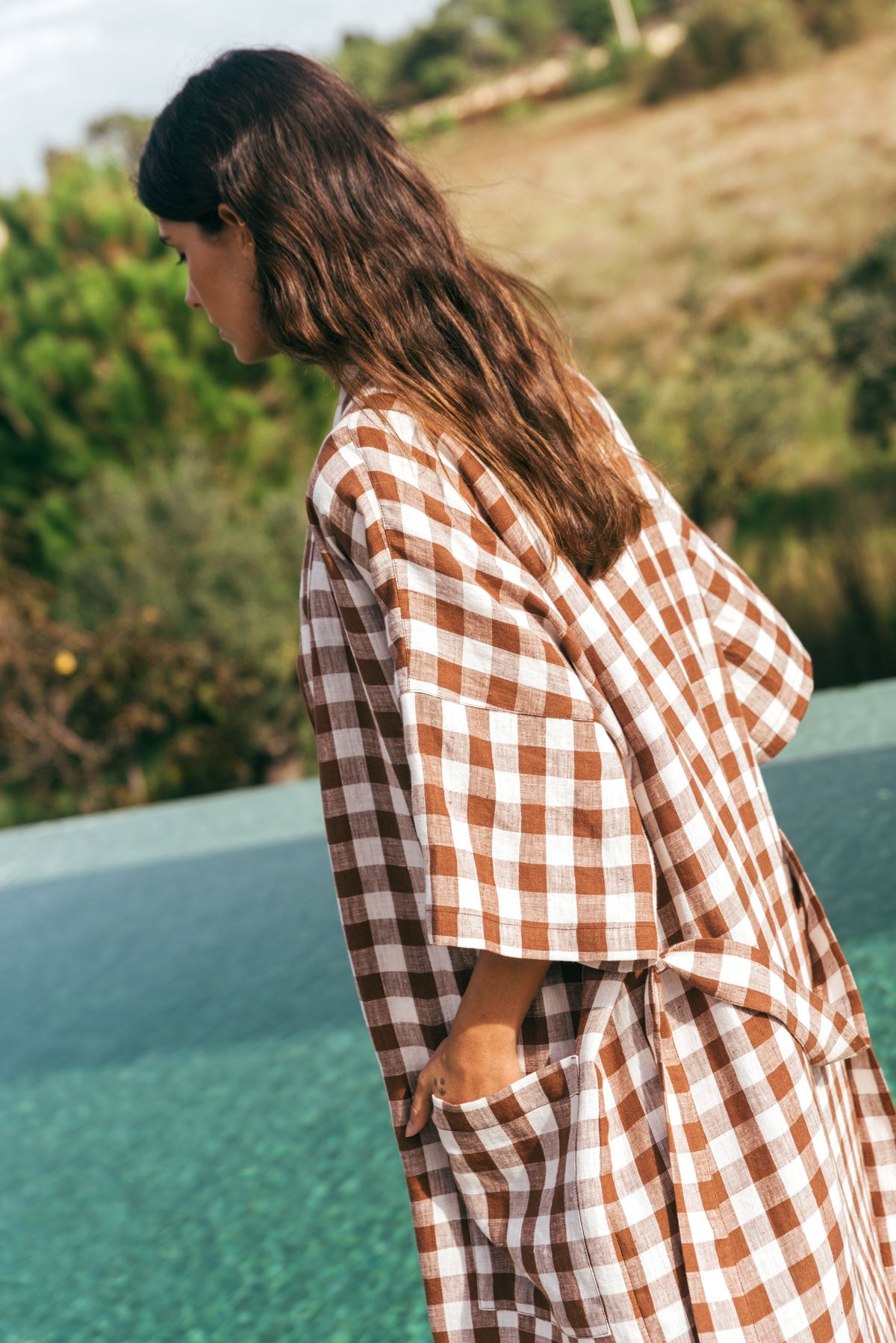 A relaxed linen robe designed in a kimono-inspired silhouette. Finished with a classic self-tie belt for an adjustable fit and two large front pockets for practicality. Suitable for lounging at home or layering over sleepwear.