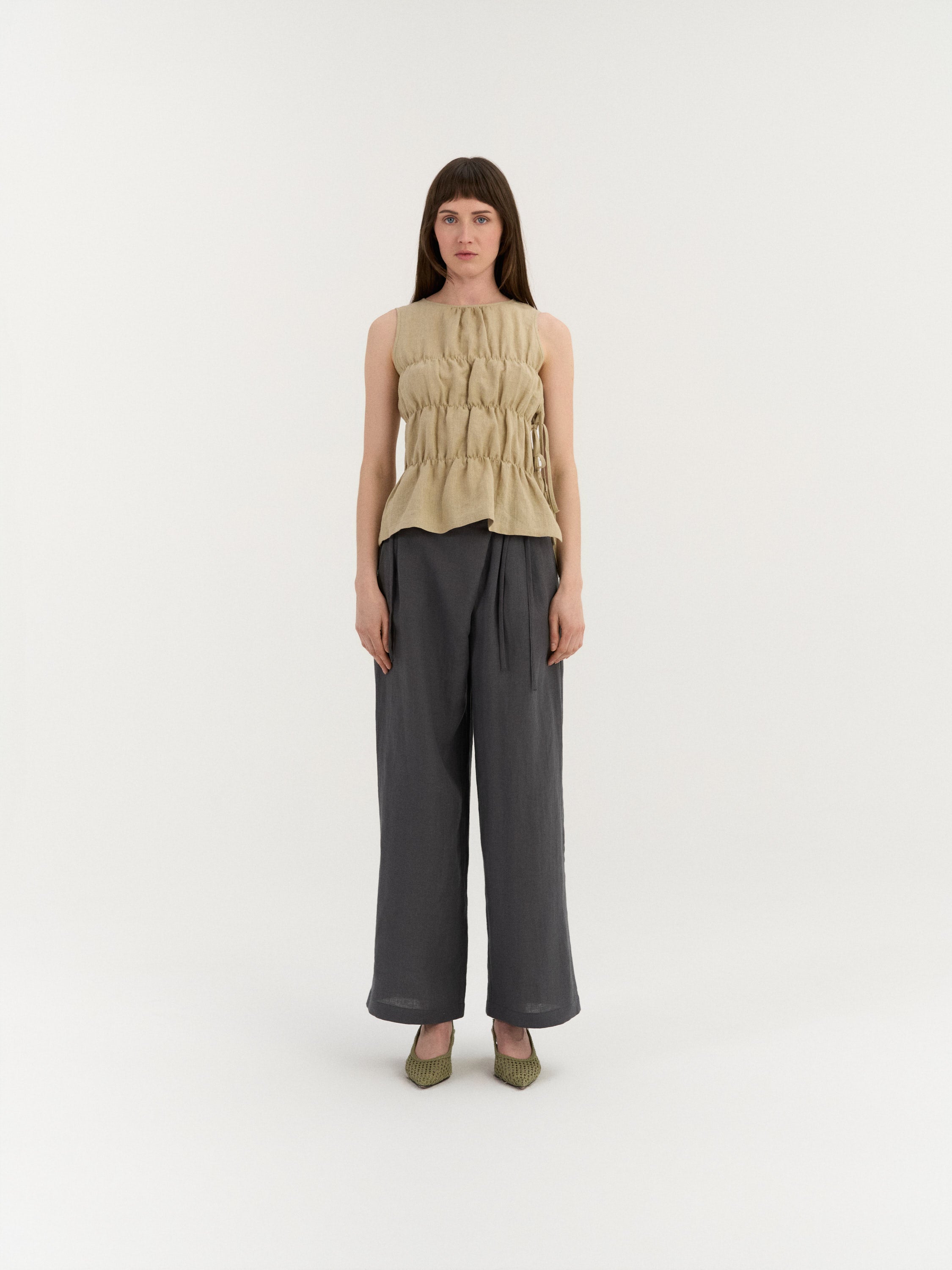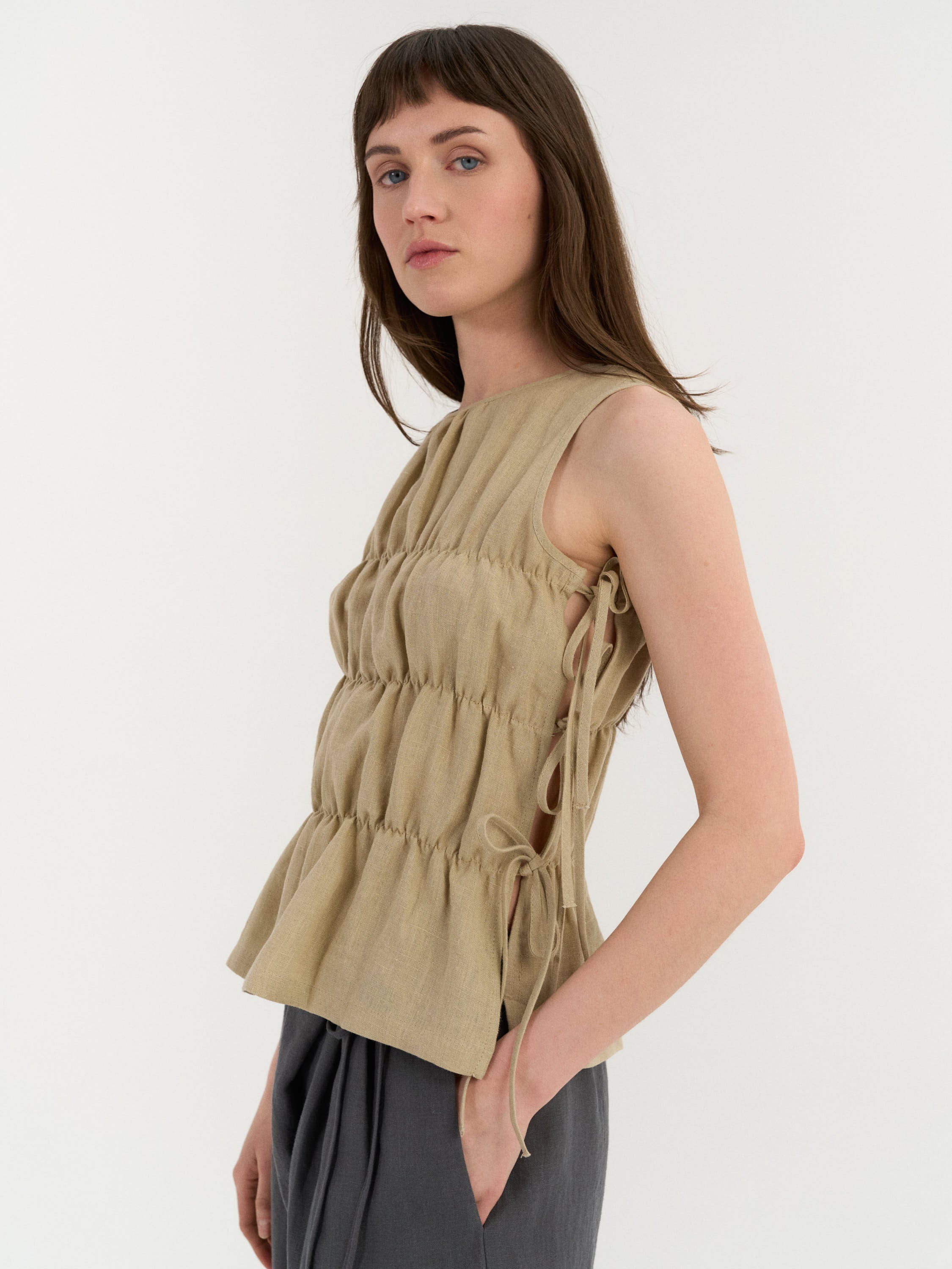 Sleeveless top with a high neckline and softly gathered panels that create texture and volume. The sides feature adjustable tie closures that allow the fit to be customized while adding an open, airy detail.