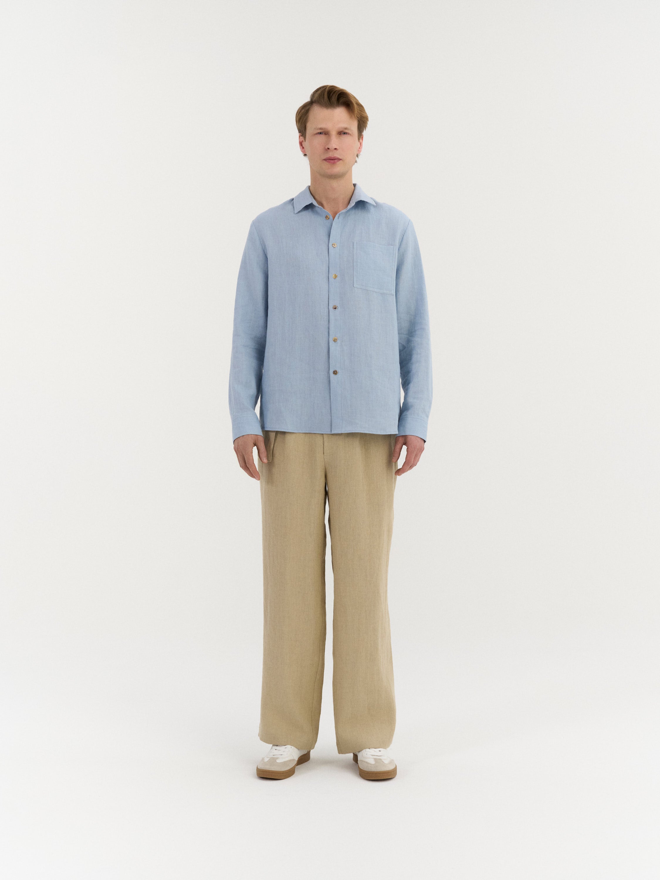 Long-sleeve shirt with a classic collar and a button-front closure. The design features a single chest patch pocket and a back yoke with a central pleat for added ease of movement. Finished with buttoned cuffs and a gently curved hem.