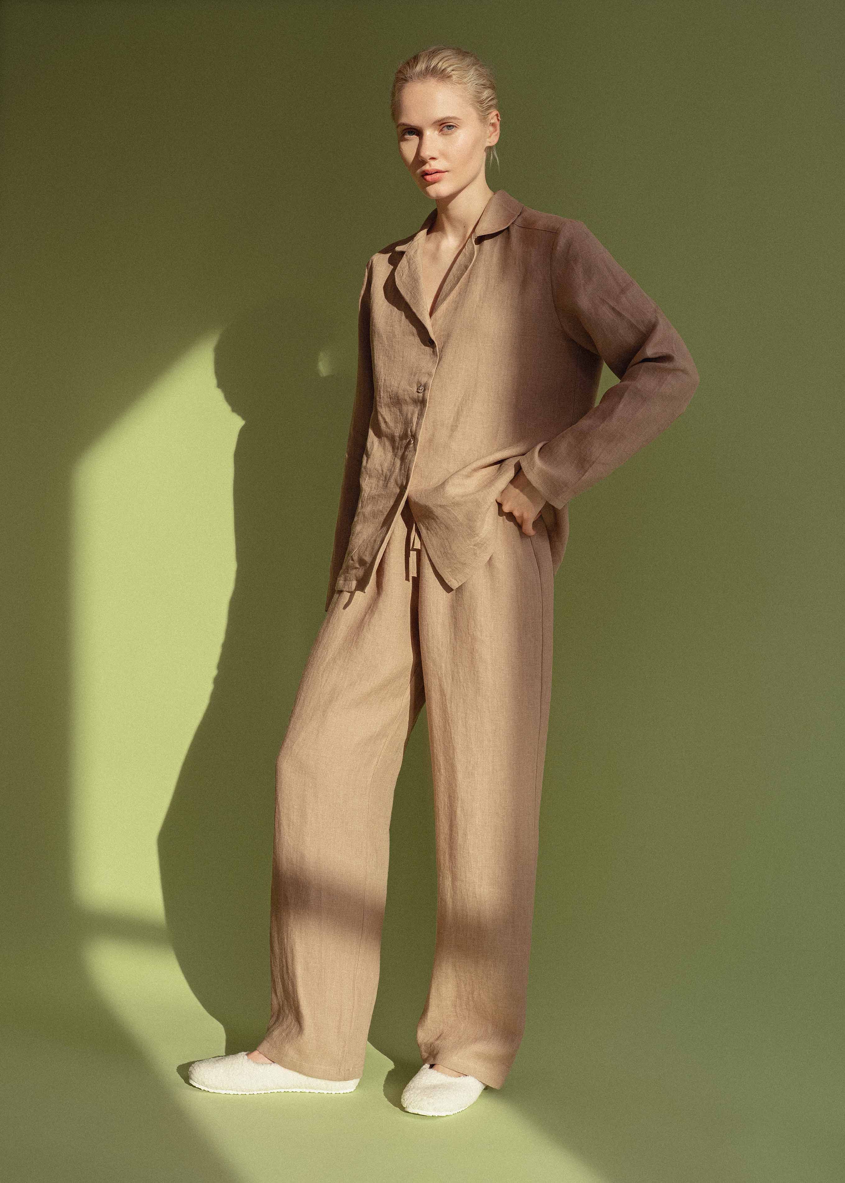 Léger et confortable, il invite à ralentir. La chemise boutonnée, au col simple et aux deux poches plaquées, s’associe à un pantalon à taille élastiquée avec cordon, à la ligne nette et sans poches.